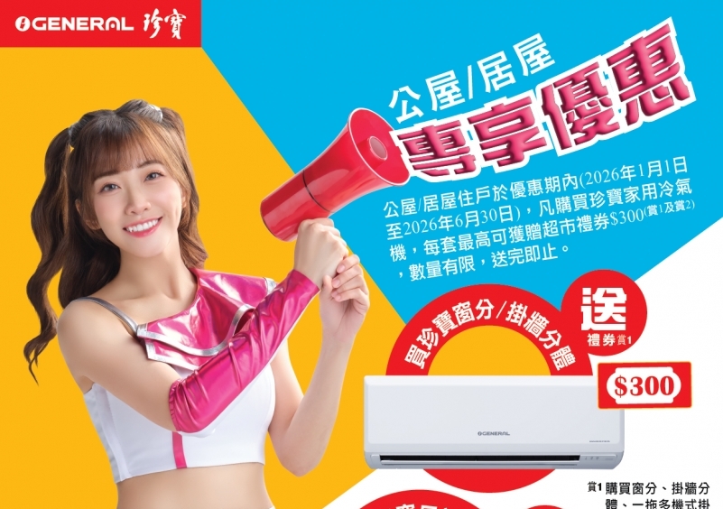 Due to good repsonse, the promotion period has been extended to 30 Jun 2026, consumer living in public rental housing or subsidised housing scheme flats, who purchase the GENERAL airconditioner, each set can get up to $300 supermarket coupons.